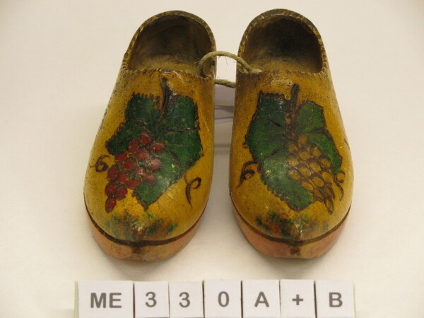 Modelklompen, Frankrijk, 19e eeuw Modelklompen, bedekt, hoge wreef. Spitse opgaande neus. Zoolsimulatie door rits, lijn en verf. Met hak. Op de kap beschildering van trosdruiven (rood op A en wit op B). Tekst aan de zijkant. Dijon (A) en La Bourgogne (B).