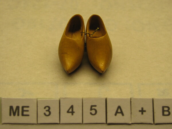 Modelklompen, Frankrijk, Eind 19e eeuw Kleine houtsnijwerk modelklompen (uniek exemplaar). Bedekt met hoge wreef. Iets brede opgaande neus. Op kap gesneden zwaluw, vliegt naar buiten. In snavel klavertje vier. Zand ondergrond. Ketting van negen schalmen aan hiel vastgemaakt..