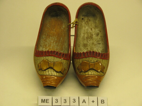 Souvenirklompen. Frankrijk. 20e eeuw Souvernirklompen, kapklomp. Opgaande puntige neus, hoge wreef, hog hak. Twee koperen wreefbanden. Koperen nageltjes, koperen bandje over de neus. Stukje textiel over de wreef. Op de kap opschrift:: S-T+POL.