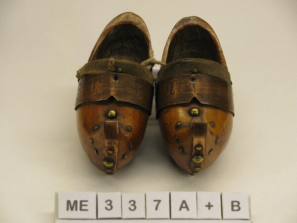 Kindergaloches. Houten zool met hak. Bovenzijde: Hoge leren schoen met vetergaatjes (veters niet meer aanwezig), hoge enkel. Textielrand bovenlangs. Stompe neus verstevigd met stukje ijzer. Onder hak: nr. 33. Stof aan binnenzijde schoen. B: zijkant beschadigd. Nr. 14 in ijzeren plaatjes. Bruin, zwart, wit.