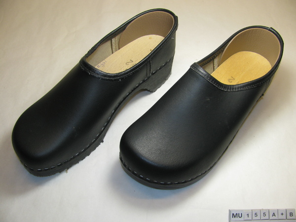 Schoenklompen, Denemarken, Eind 20e eeuw Schoenklompen, A- houten zool met lage hak en kunststof zool eronder, B- houten binnenzool met dikke kunststof zool eronder/-omheen. Bovenkant van leer, geheel bedekt en brede neus (schoenbreed). Hiel met extra kunst-/nepleer stuk binnenin. Extra leren rand om de bek. Zwart, blank.