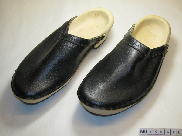 Schoenklompen, Oostenrijk, Eind 20e eeuw Schoenklompen met houten zool en hiel. Met hoge hak en ronde neus. Rubber zool onder voorvoet en hak. Leren kap met spijkertjes op hout bevestigd, met smalle wreefband langs de rand. Zwart, blank.