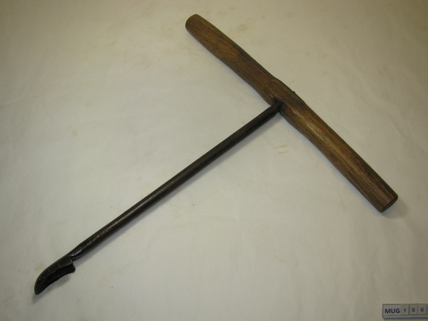 IJzeren staaf met middenin een snijblad (L37-B3,5cm) en een kromme haak aan het uiteinde en afplatting aan handvat zijde. Zwart.