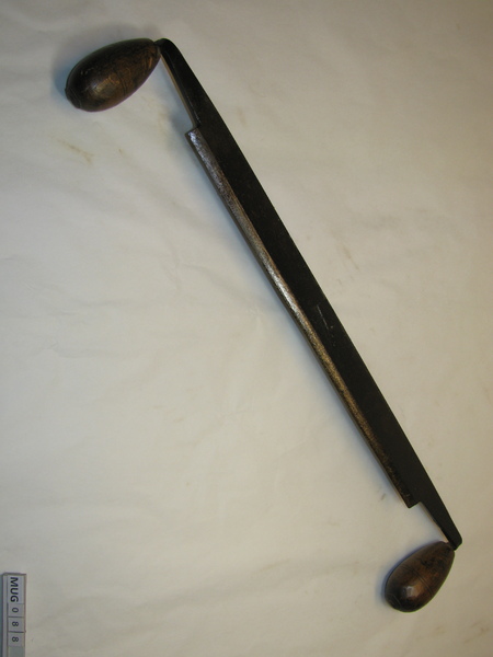 Trekmes, Nederland, Midden 20e eeuw Recht ijzeren mes met twee eivormige houten handvaten. Onleesbaar fabrieksmerk op ijzer. Zwart, bruin.