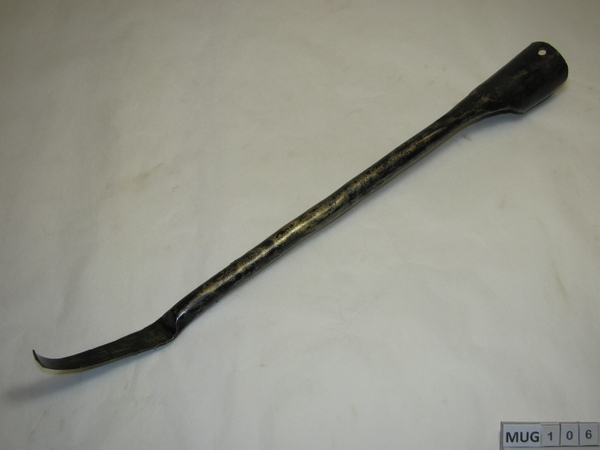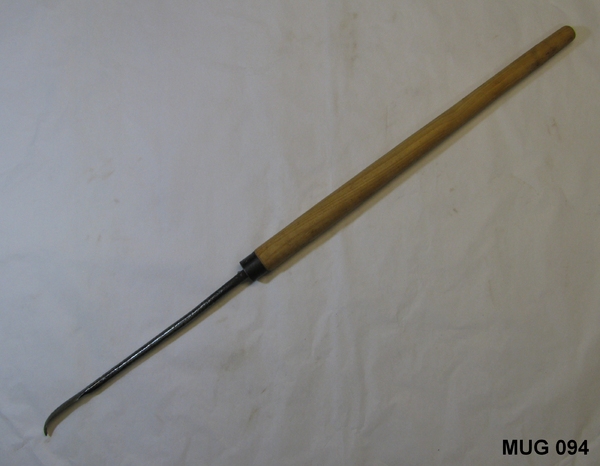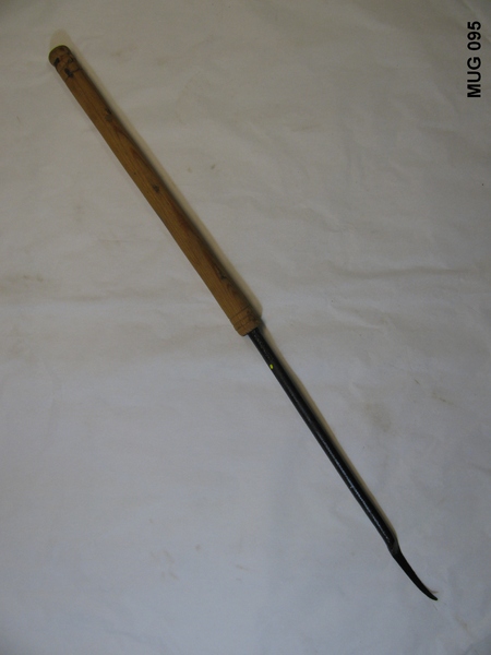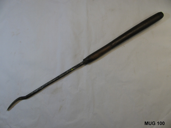 Hakkenmes, Nederland(?), Begin 20e eeuw Ronde ijzeren steel met sterk gekruld mes. Steel eindigt vierkant en puntig. Op steel: 3XO. Zwart.