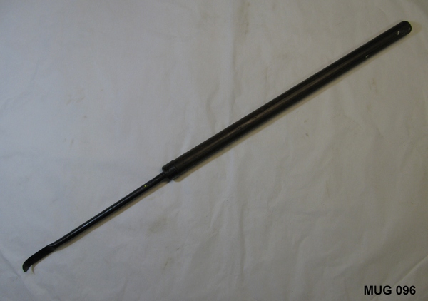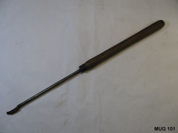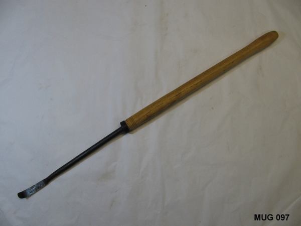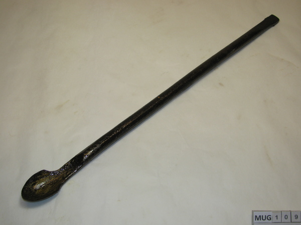 Lepelboor, Nederland(?), Begin 20e eeuw Ronde ijzeren stang met langwerpige, kleine, puntige lepelboor. Stang heeft 5 inkepingen en een plat uiteinde. Zwart.