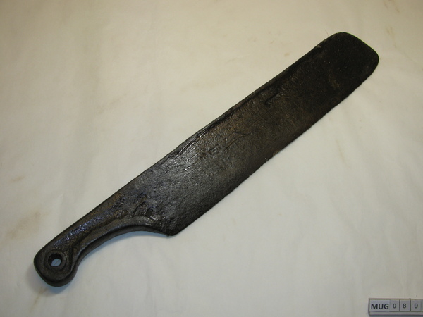 Kloofmes, Nederland, Begin 20e eeuw Breed ijzeren mes, scherp aan de onderzijde, breed aan de bovenzijde. Mes is 1 geheel met kort ijzeren handvat met gat. Zwart.