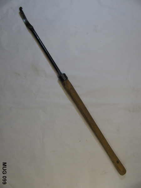 Teenmes, Nederland(?), Begin 20e eeuw Ronde ijzeren stang met tweezijdig snijdend mes, puntje is sterk gekruld. Met land rond houten handvat met ring. Zwart, bruin.