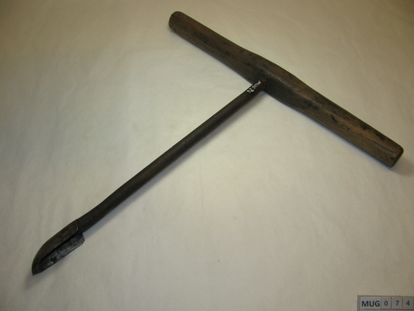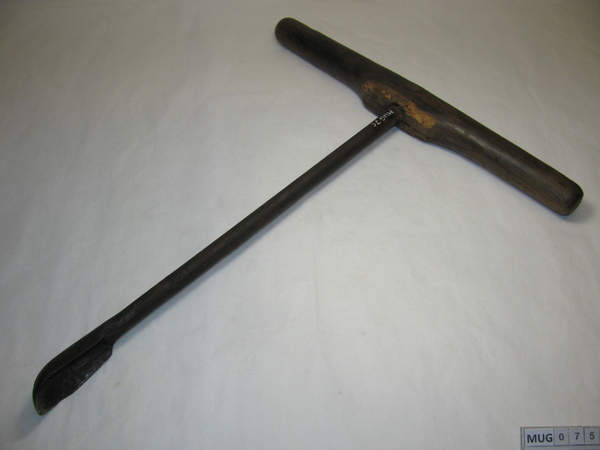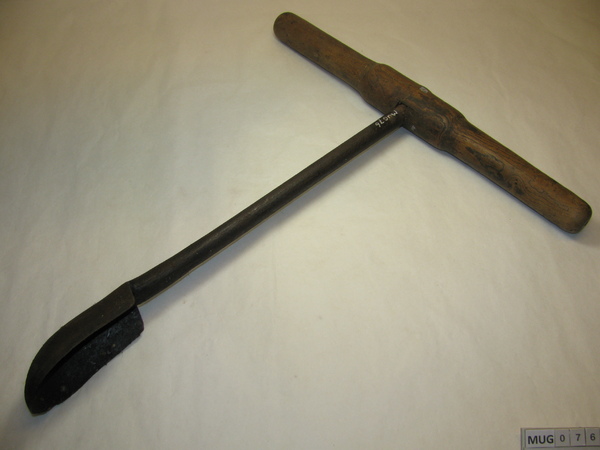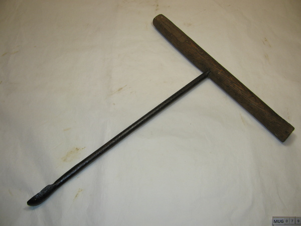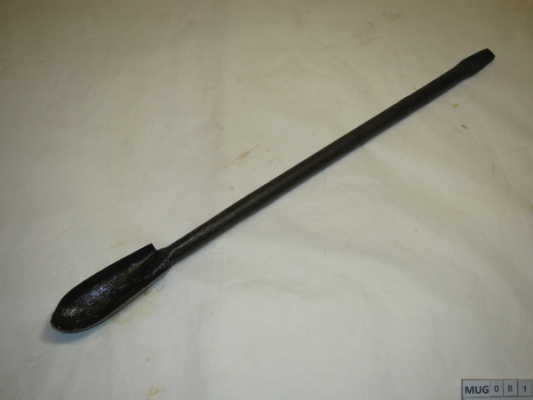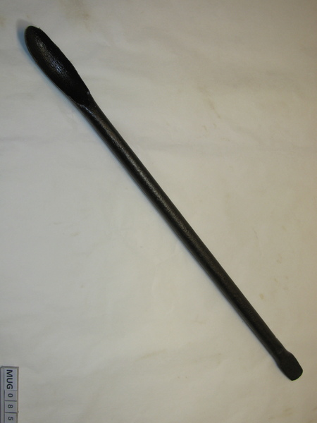 Ronde ijzeren stang met langwerpige lepelboor, om andere uiteinde is huls bevestigd met dwarshuls, daardoor loopt een klein houten handvat (helft afgebroken). Zwart.