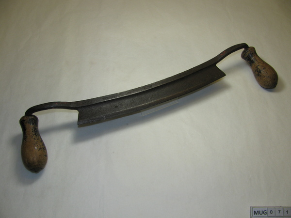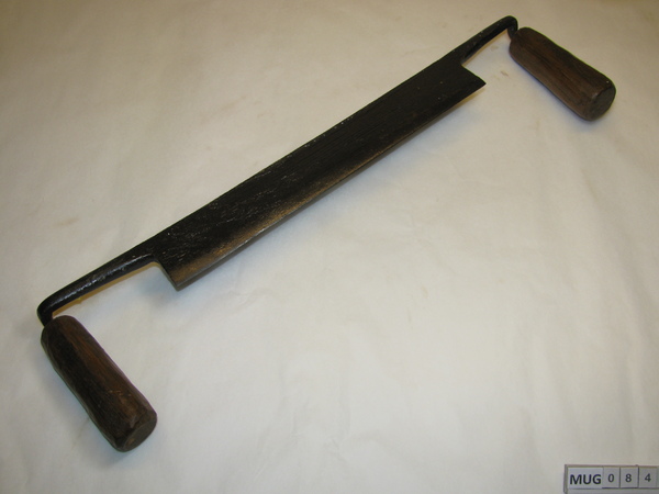 Trekmes, Nederland, Begin 20e eeuw Recht, breed ijzeren mes met twee houten handvaten. Zwart, bruin.