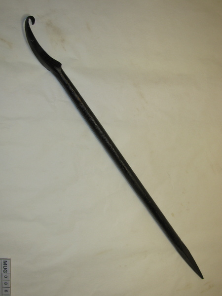 Teenmes, Nederland, Begin 20e eeuw Ronde ijzeren stang met tweezijdig snijdend mes waarvan het spitse puntje is omgekruld. Het andere einde loopt spits toe. Zwart.
