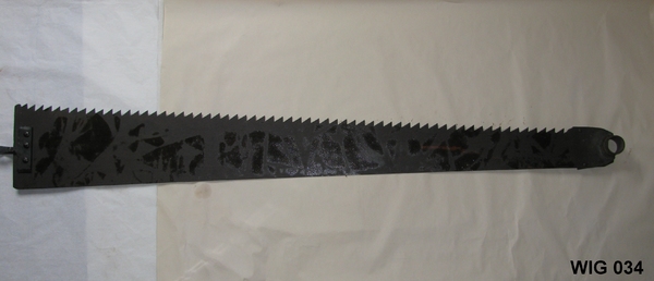 Trekzaag, Nederland, Begin 20e eeuw Grote ijzeren taps toelopende zaag met aan een kant een ronde huls met stukken ijzer vastgeklonken. Aan de brede kan een ijzeren rechthoekige stang, ook vastgeklonken, ook met huls. Zwart.