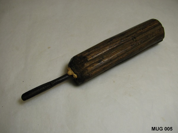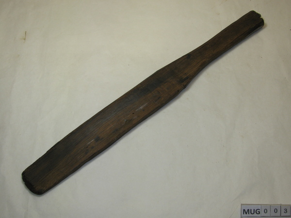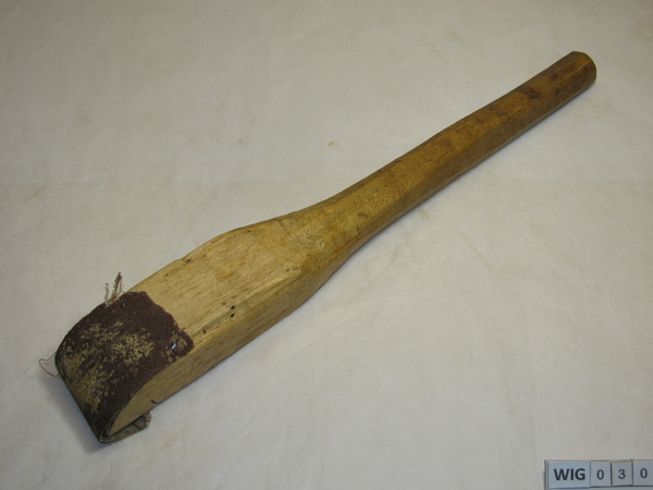 Ruw houten, taps toelopend stuk hout met ronde steel. Opschrift: EW 29. Blank.