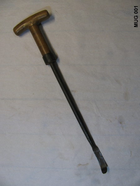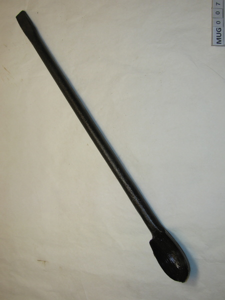 Ronde ijzeren stang met plat mes, recht van boven, gebogen van onderen. Lange houten steel met ijzeren ring. Opschrift: EW 23. Blank, zwart.