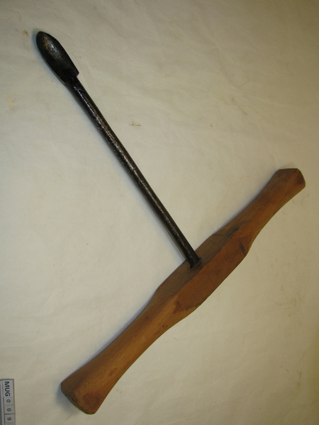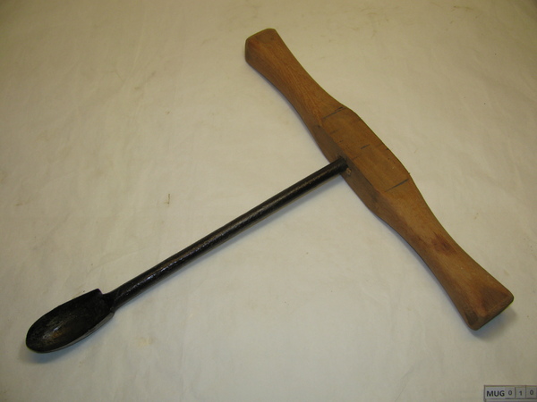 Lepelboor, Nederland, Midden 20e eeuw Ronde ijzeren stang met kleine lepelboor. Fors houten handvat met breed uitlopende uiteinden (vernieuwd). Bruin, zwart.