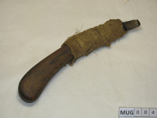 Groot ijzeren mes. Aan weerszijden van het ijzeren handvat zijn stukken hout aangebracht met drie bouten en moeren, aanhechting is gebroken geweest en duidelijk gerepareerd dmv. laswerk. Opschrift: EW 26. Zwart, bruin.